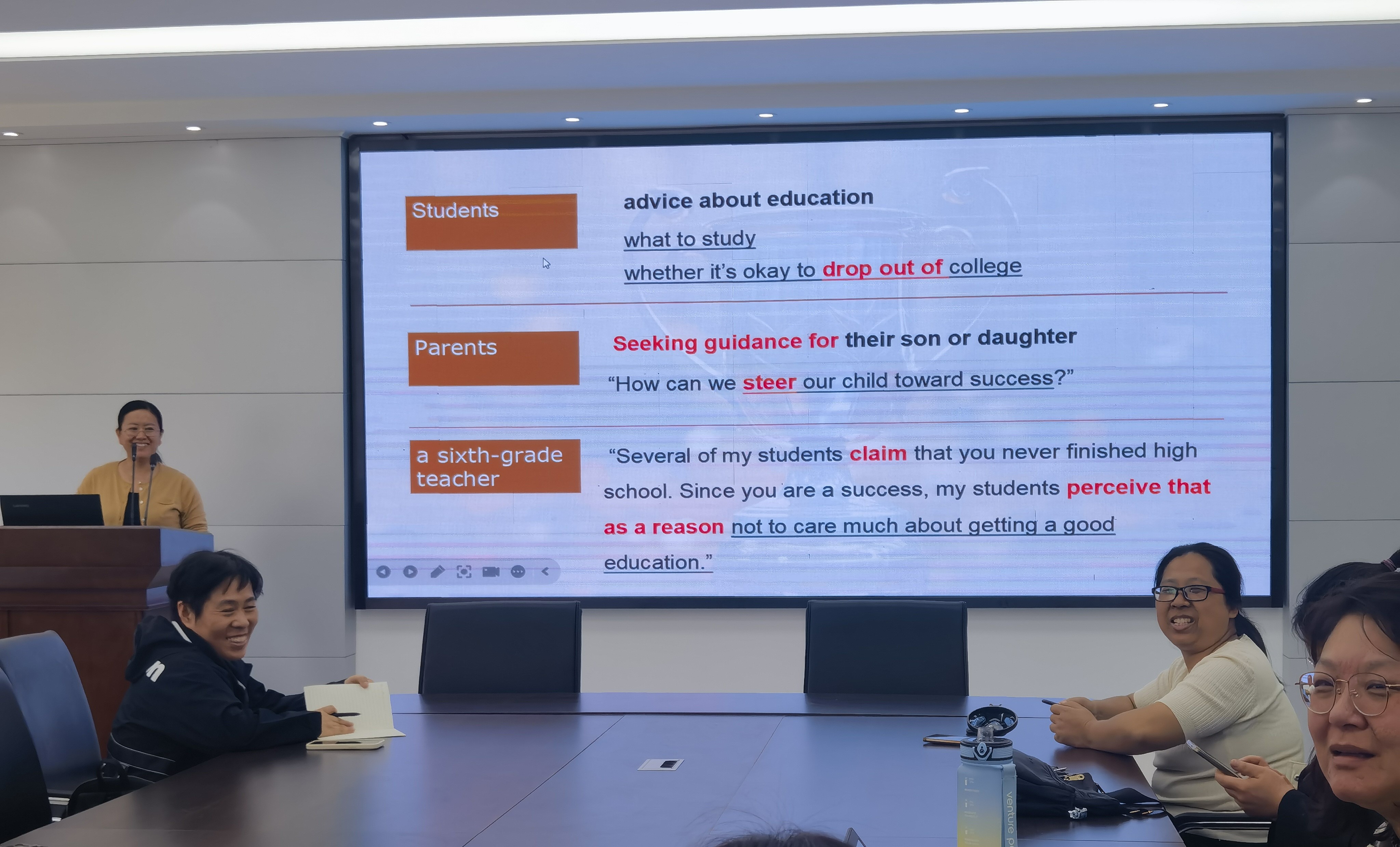 杜敏老师对《大学英语IV(进阶英语)》第三单元的教学设计进行了说课。老师们对各教学环节衔接的紧密性和课件的制作提出了建议。