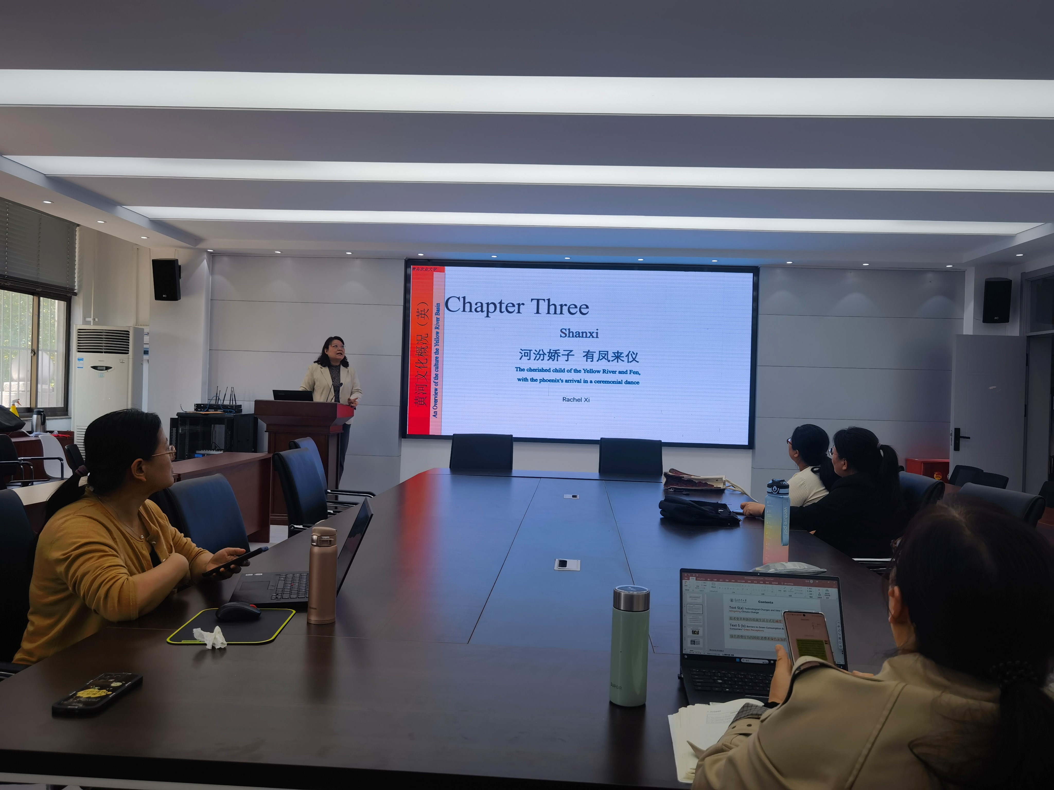 席晓老师对《黄河文化概汉(英)》第三单元—三晋文化的教学设计进行说课。该课程深度挖掘了三晋文化的内涵,信息量大,资源丰富,教学手段多样。老师们对教学环节的紧密衔接进行了讨论。