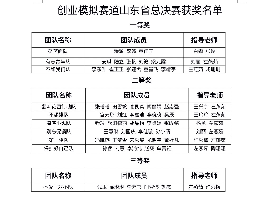 创业模拟赛道山东省总决赛获奖名单