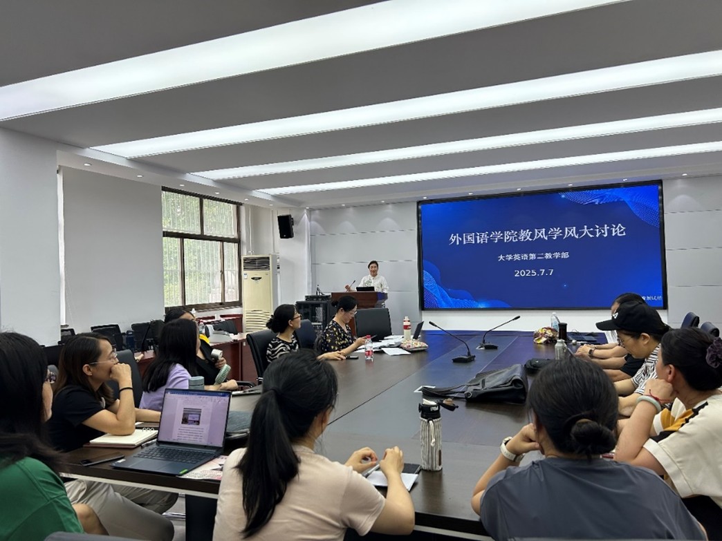 为积极响应公司关于开展“教风学风大讨论”的号召,深化新时代大学英语教学改革,切实提升育人质量与教学实效,大学英语第二教学部于7月7日下午在文经楼C220举办专题研讨活动。本次研讨以“深入开展教风学风大讨论,聚焦AI赋能教学新路径”为主题,由教学部主任聂庆娟主持,全体教师参加。