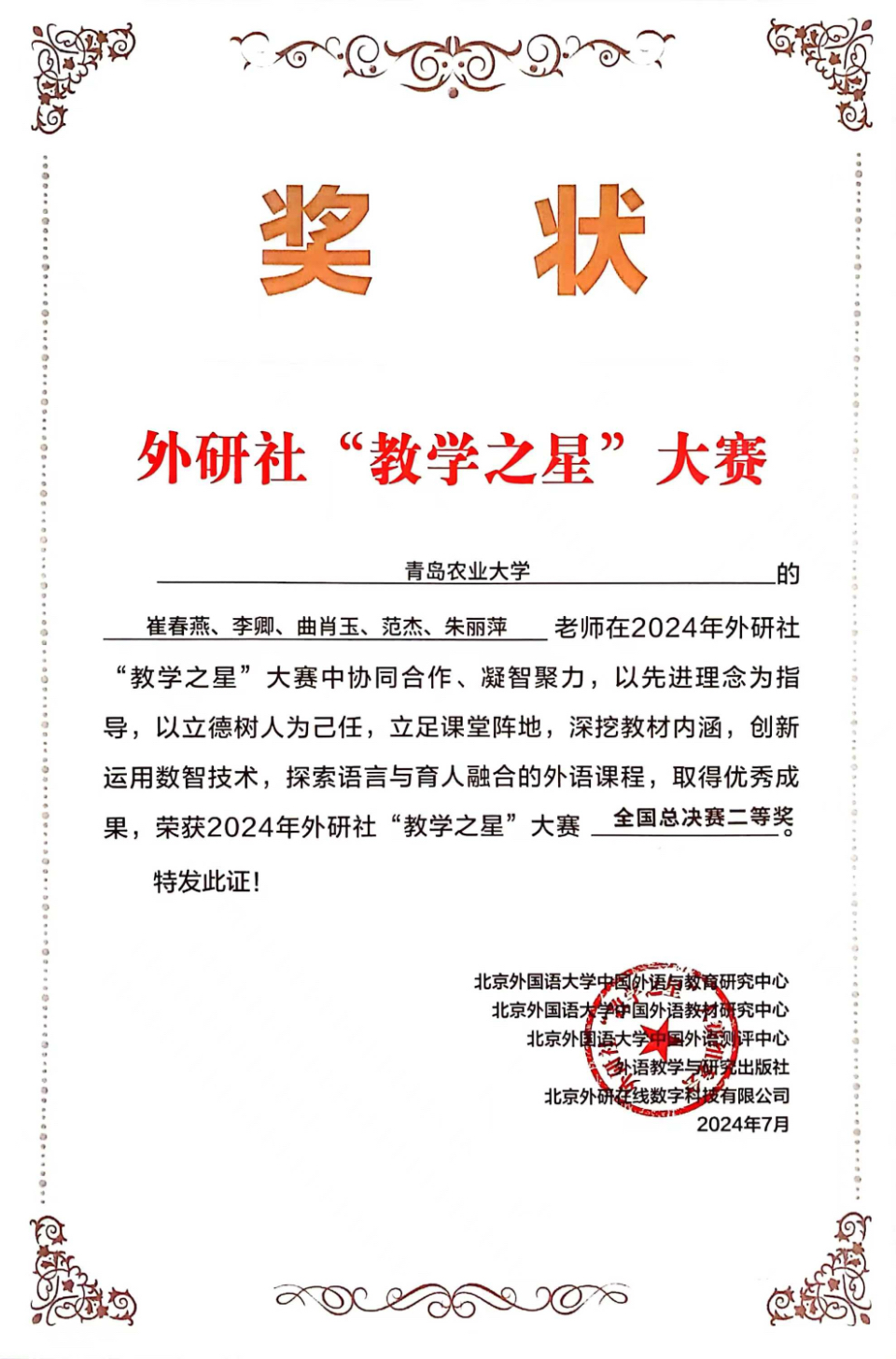 2024年7月22-23日,由北京外国语大学中国外语与教育研究中心、北京外国语大学中国外语教材研究中心、北京外国语大学中国外语测评中心和外语教学与研究出版社共同举办的2024年外研社“教学之星”大赛全国总决赛在太原举行。经过激烈比拼,由betway88西汉姆联大学英语第二教学部崔春燕、李卿、曲肖玉、范杰、朱丽萍五位教师组成的教学团队,荣获全国总决赛二等奖。
